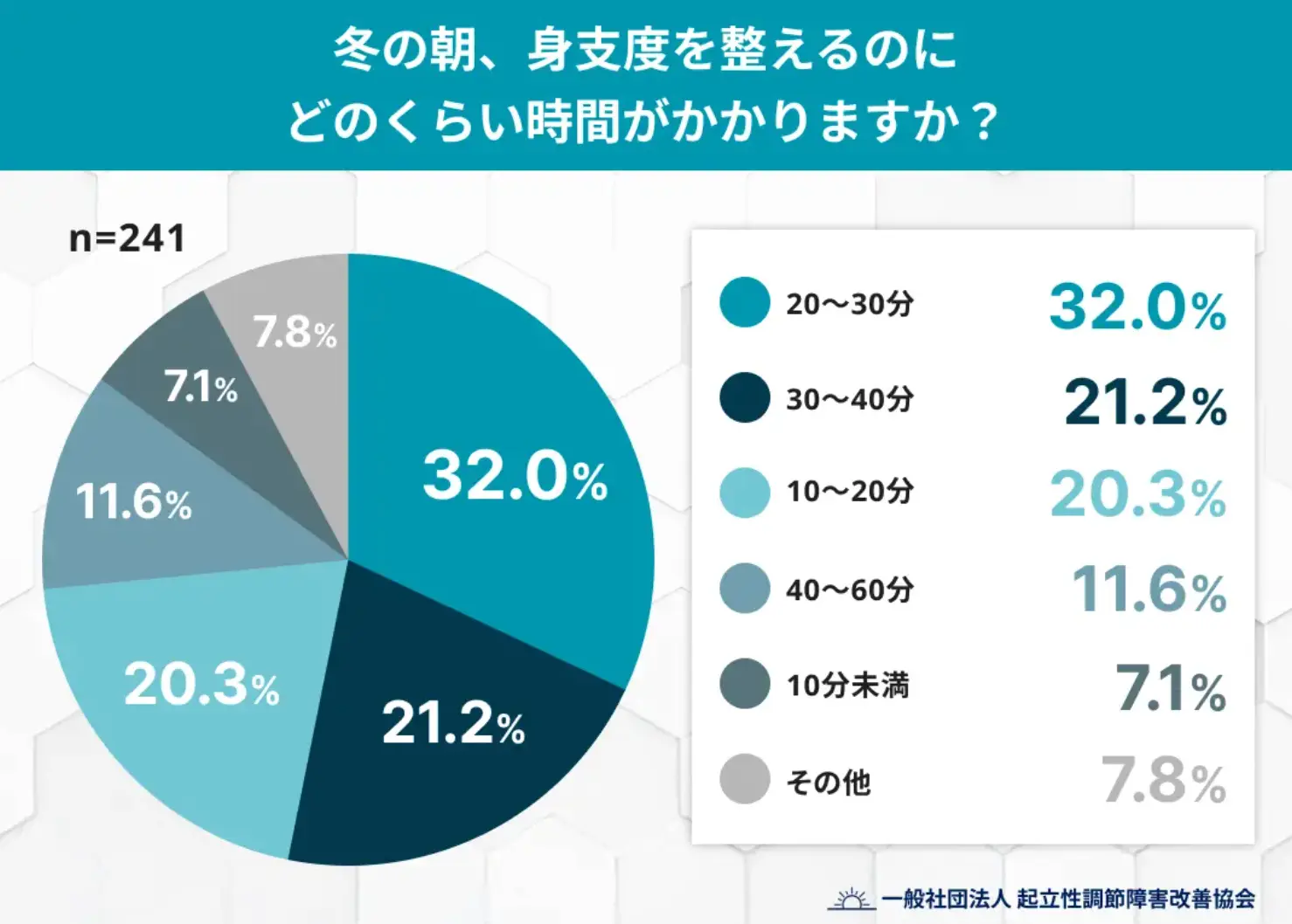 → 最も多い回答は20〜30分。冬は動き出しに時間がかかり、準備が全体的に長引く傾向が見られます。