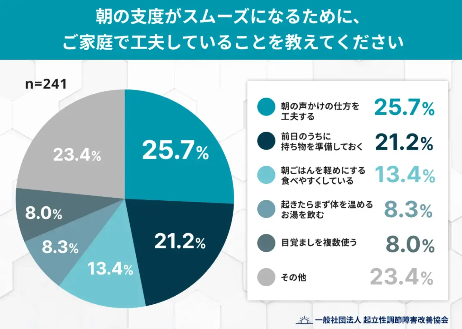 - 朝の支度をスムーズにする工夫として 「声かけを工夫する」25.7%「前日準備」21.2% が上位に挙げられる