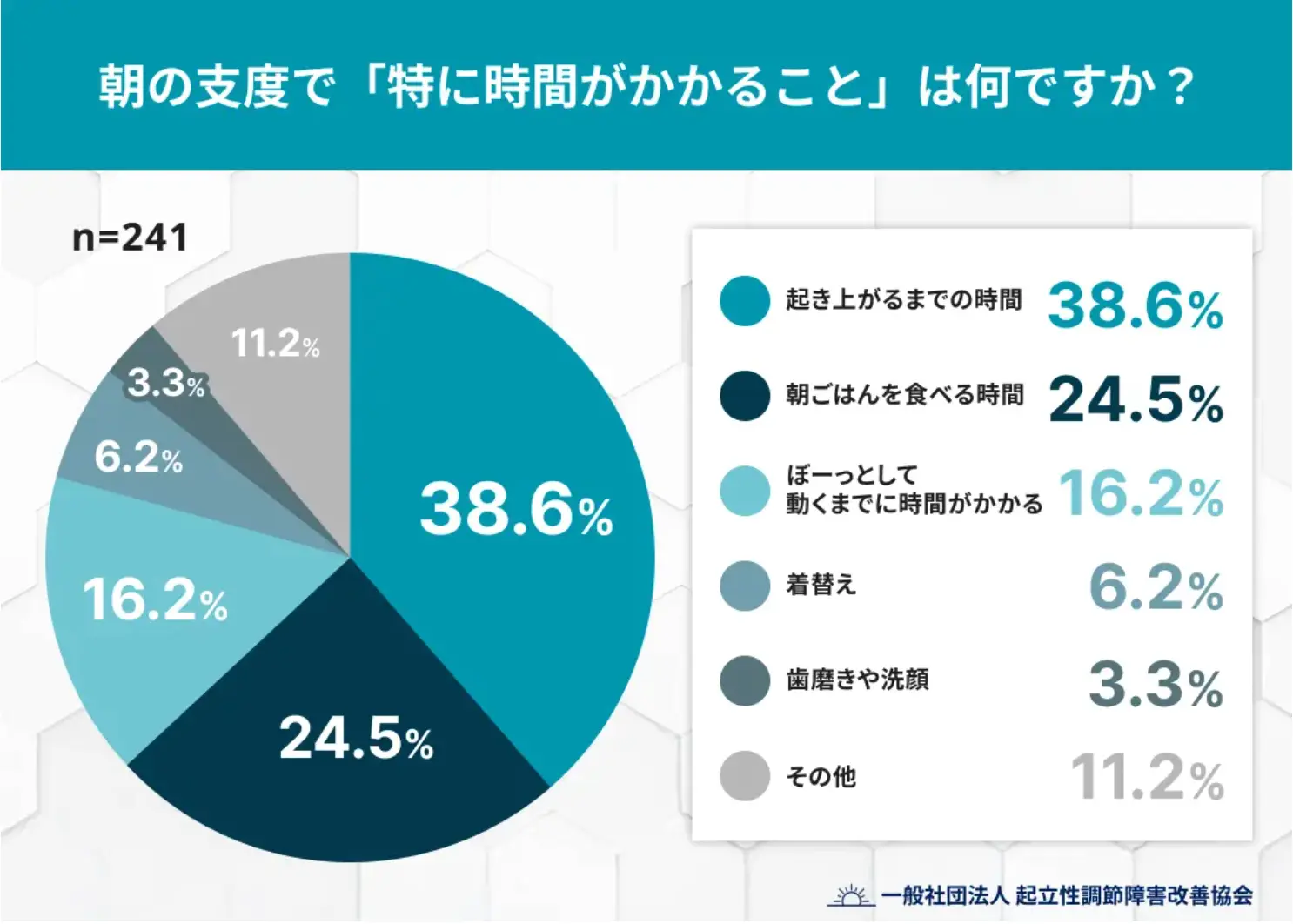 → 最も多かったのは「起き上がるまでの時間」。布団から出るまでに時間を要し、その間に支度の段取りが崩れやすい状況がうかがえます。「ぼーっとして動けない」という回答も多く、心身の切り替えを促すサポートが求められる場面といえそうです。